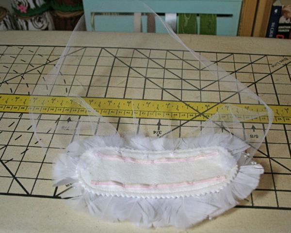 Cut a piece of tulle 24 inches by 9 inches to make a fingertip veil. Curve the edge that will be around the face, and pleat the edge at the headpiece. Use pins to figure out how you want the veil to lie, then attach it with a few stitches.