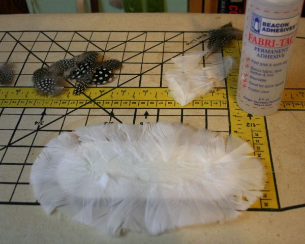 Begin adding feathers. It's best to lay out the pattern you want before you start gluing. I started with white feathers at the base, letting them overhang about an inch.